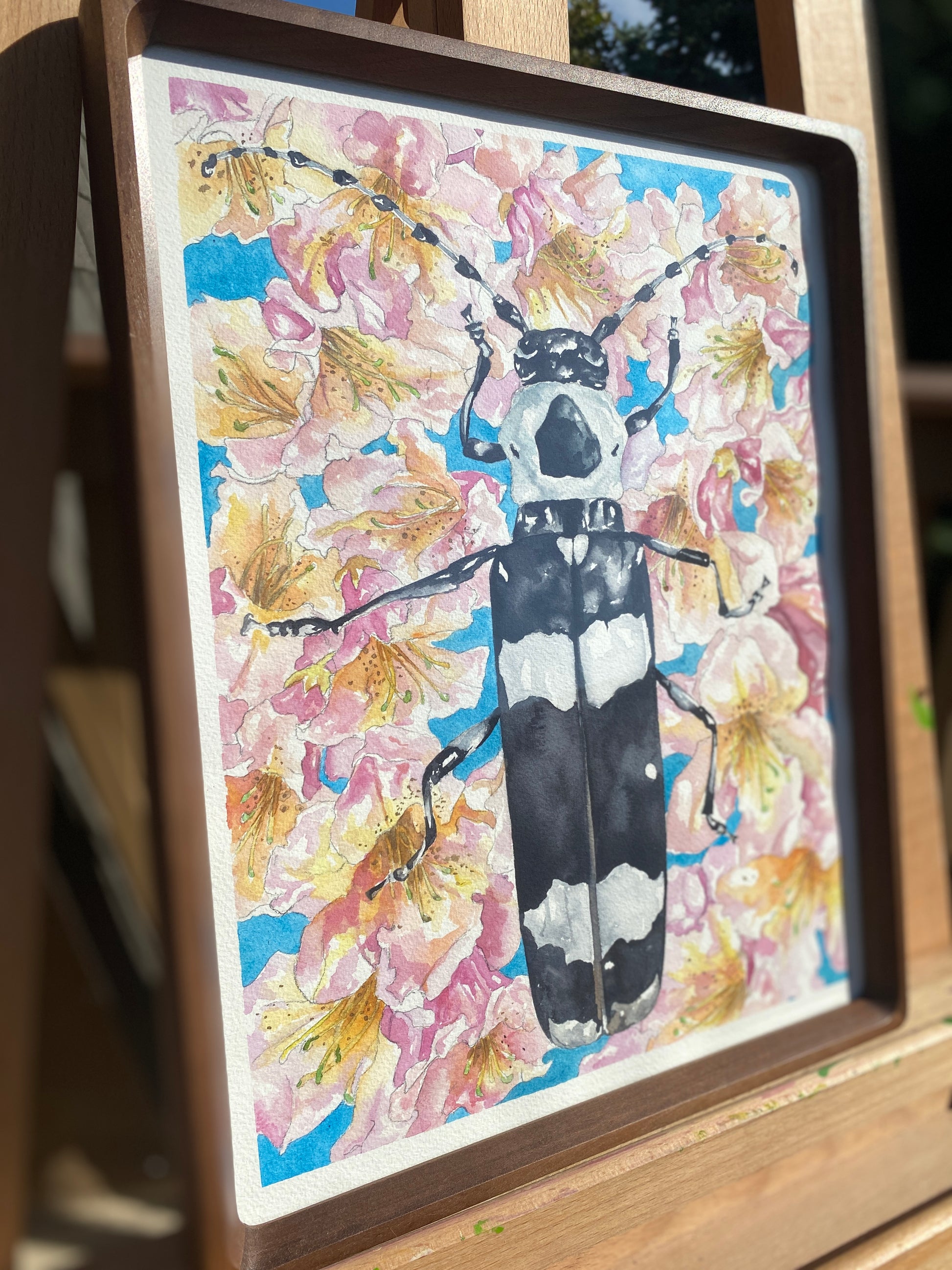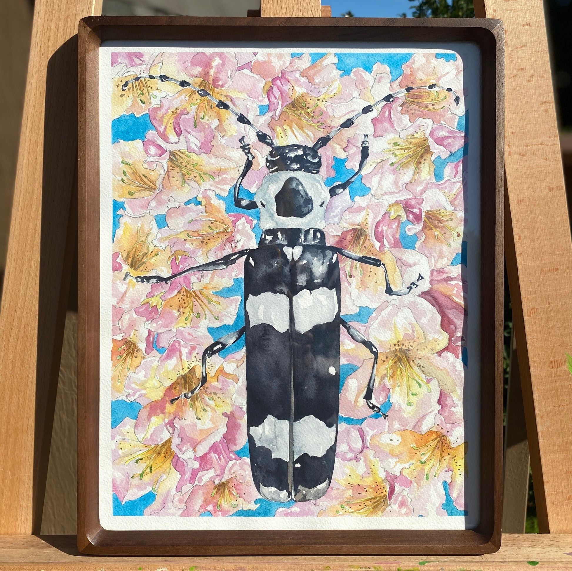 This is an original watercolor painting on paper by Emma Baldwin of an Alder Borer Alder Original painting by Emma H. Baldwin of an alder borer beetle, seen in Leavenworth, Washington. This piece was inspired by a surprise encounter with one of these beetles in 2025.